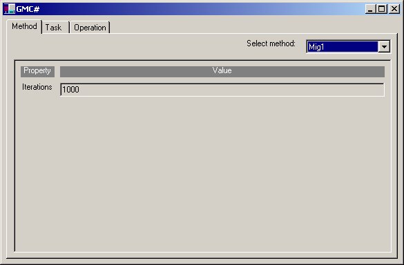 The choice control at the top of the window shows the list of supported methods. One of them is to be selected. After selecting a method the window changes. The configuration window depends on the actual method selected, but usually it will have an "Iterations" field, where the number of iterations, can be changed. If the entered value is invalid, or the number is out of bounds, the appropriate error message is displayed.