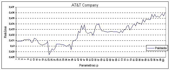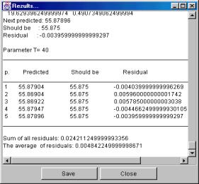 Kuomet sprendžiamas prognozavimo uždavinys paspaudus Calculation lange esantį mygtuką Graphic (mygtukas bus aktyvus jei Parameters lange Indicator for one p evaluation (0), increasing p(1) įvedimo lauke buvo įvesta reikšmė -1) lange Residuals graphic bus pateiktas grafinis nuokrypio priklausomybės nuo parametro p atvaizdavimas.