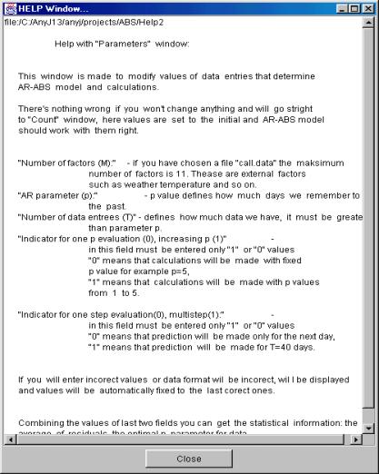 1. Number of factors (M) : - įvedimo lauke galima įvesti skaičių iš intervalo [1; 32767]. Įvestas skaičius apibrėš išorinių faktorių kiekį, kurie bus įvertinami tiek sudarant konkretų AR-ABS modelį tiek prognozuojant sekančiam laiko momentui. M= 1 reikš jog atsižvelgiama tik į patį prognozuojamą didį ir jo reikšmes praeities momentais. Rekomenduojama, kad išorinių faktorių kiekis nebūtų didesnis nei duomenų failo eilutės elementų kiekis, priešingu atveju duomenys apibrėšiantys išorinius faktorius bus imami iš sekančių failo eilučių.