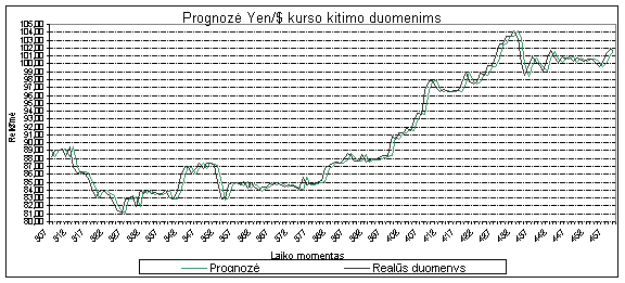 34 pav. Yen/$ kurso kitimo prognozė AR-ABS modeliu