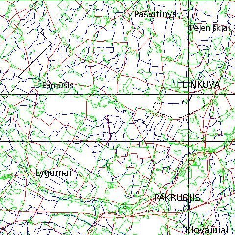 Valstybinė Geodezijos ir kartografijos tarnyba, 1998.Pakruojo apylinkių hidrografija, keliai ir žemėnaudos .sa Lapo " Pakruojis" rivers.e00, infra.e00, landu.e00 ir km5.e00 sluoksniai GRASS - 62 formate. |