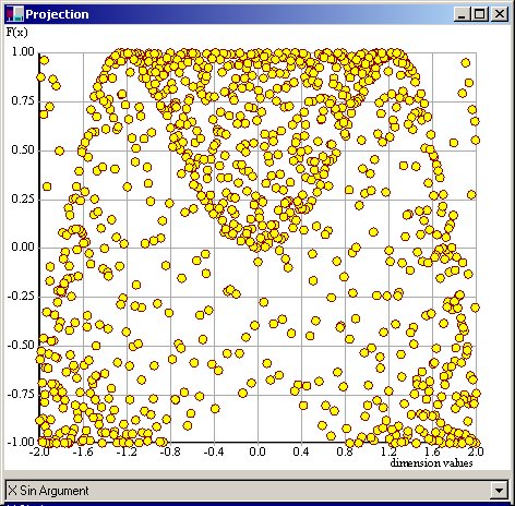 The projection windows show the relation between one of the dimensions of the domain of the minimization function and the value of the function.