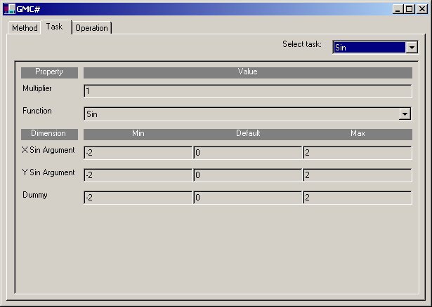 The choice control at the top of the window shows the list of available tasks. One of them should be selected and configured before optimization starts. After selecting a task the window changes. The configuration window depends on the actual task selected. It lists the properties of the task and then the range of the minimization domain.
