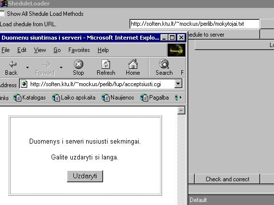 - Testavau programą su esamais serveryje duomenimis per atstumą naudodama naršyklę Internet Explorer4. Tvarkaraščio programa veikia naudojant optimizavimui Mig1 ir Bayes metodus. Gautus optimizavimo rezultatus galima matyti ekrane, nusikopijuoti bei atsispausdinti.