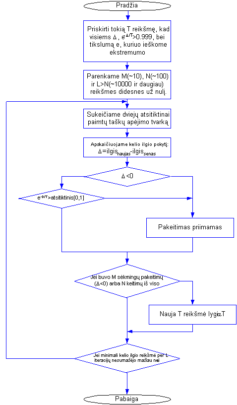 čia "delta" yra energijos pokytis (arba funkcijos pokytis), T sistemos temperatūra. Detaliau SA algoritmas pavaizduotas 2 pav. blokinėje schemoje. |