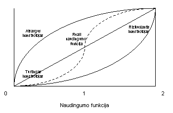 Abiem atvejais mes privalome ivertinti ne tik grynus pinigus, bet ir naudinguma, kuri gaus kiekvienas investuotojas. Gautas pinigu kiekis ne visada yra tiesiog proporcingas gautam naudingumui. Tai paaiskina ir si naudingumo funkciju diagrama, vaizduojanti kelias investuotoju naudingumo funkcijas. Naudingumo funkcija parodo santyki tarp gauto pinigu kiekio ir naudingumo.
