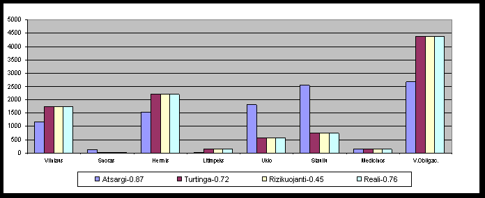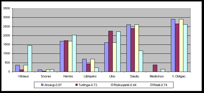 Jei nagrineti "atsargius" investuotojus, tai matysime, kad jie daugiausia renkasi patikimesnius bankus, o tuo tarpu i nepatikimiausia Medicinos banka investuotu tik apie 0.01% nuo visos sumos. Cia daugiausia pinigu bus investuota i Siauliu banka. "Rizikuojantys" taip pat nelabai linke investuoti i Medicinos banka, taciau Litimpeks jiems yra gana patrauklus atsizvelgiant i jo patikimuma.