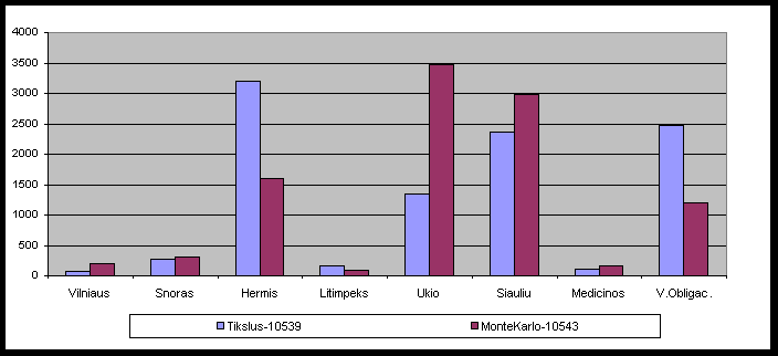 Lyginant "Tiksliu" ir "Monte Karlo" metodais gautas naudingumo funkcijas matome, kad jos beveik sutampa. taciau pinigu paskirstymas yra gana ivairus. Abiem atvejais pirmauja valstybines obligacijos, nors pirmuoju atveju su jomis konkuruoja Siauliu, Hermio ir Ukio bankai.